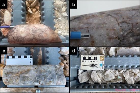 Figure 5 (a, b) Drill core composed of biotite gneiss with propylitic alteration; (c) quartzo-feldspathic gneiss with argillic alteration.