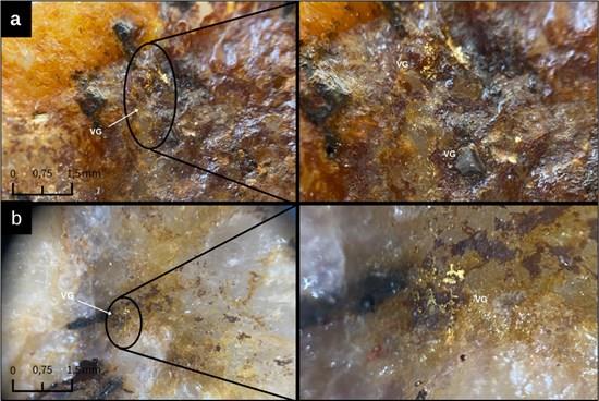 Figure 6 (a) Free gold (VG-visible gold) identified in hole PVDH-045, at a depth of 49.50 meters; (b) Free gold (VG-visible gold) in hole PVDH-015, at a depth of 95.65 m