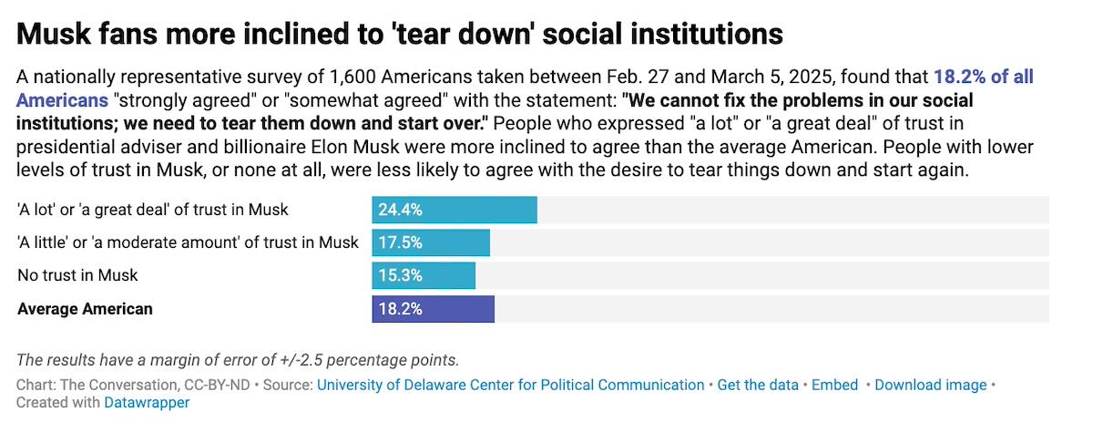 New data from the Center for Political Communication at the University of Delaware suggests that those people – the ones who want society to burn – are the ones with more, not less, trust in Musk.