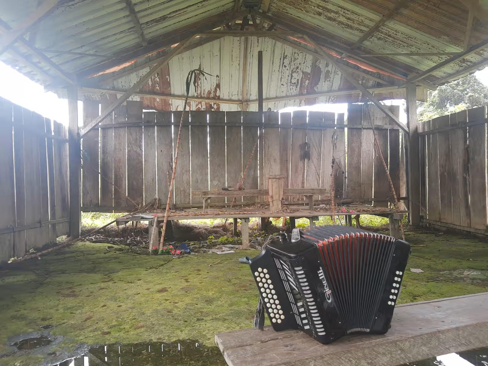 An accordion is on a bench inside the improvised temple where a pregnant woman, five of her children and a neighbor were killed by cult members in the remote hamlet of Alto Terrón, Panama