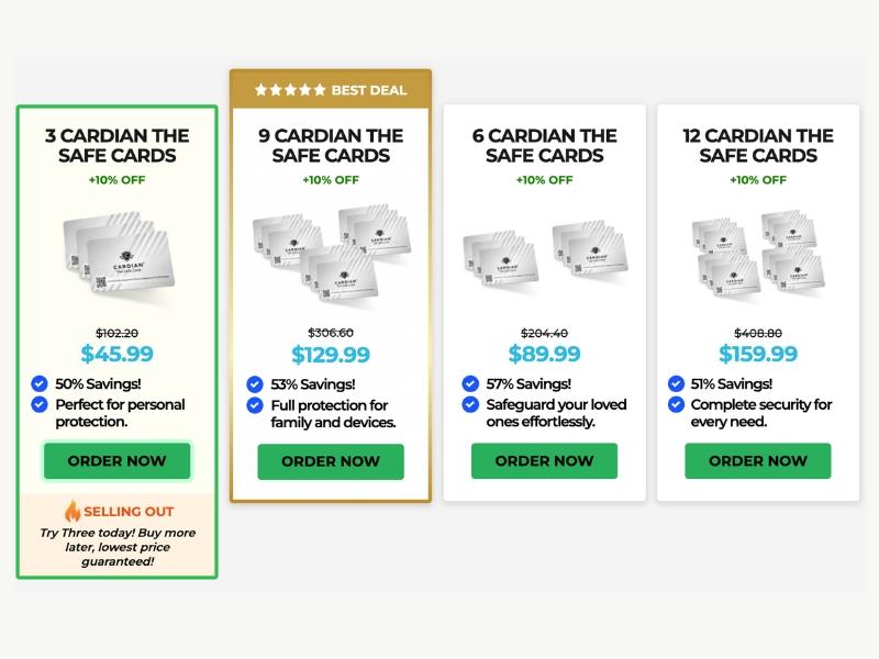 Cardian The Safe Card is offered in multiple bundles to accommodate individuals, families, or those looking to gift extra cards. As of the latest information from the official website, pricing is as follows: