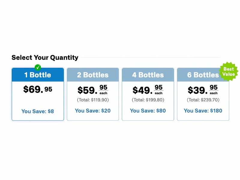 - 1 Bottle (30-Day Supply): $69.95 2 Bottles (60-Day Supply): $119.90 ($59.95 per bottle) 4 Bottles (120-Day Supply): $199.80 ($49.95 per bottle) 6 Bottles (180-Day Supply): $239.70 ($39.95 per bottle)