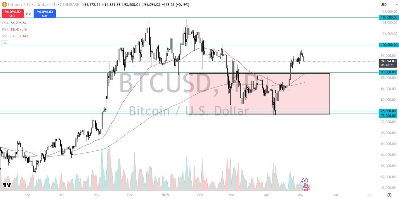 - Bitcoin continues to go sideways overall, and the Monday session of course is very quiet. Because of this, it makes a certain amount of sense that we will continue to see noisy behavior. The $94,000 level is an area that has been important multiple times, and even if we were to break down below there, I think there is significant support underneath, especially near the crucial $90,000 level.