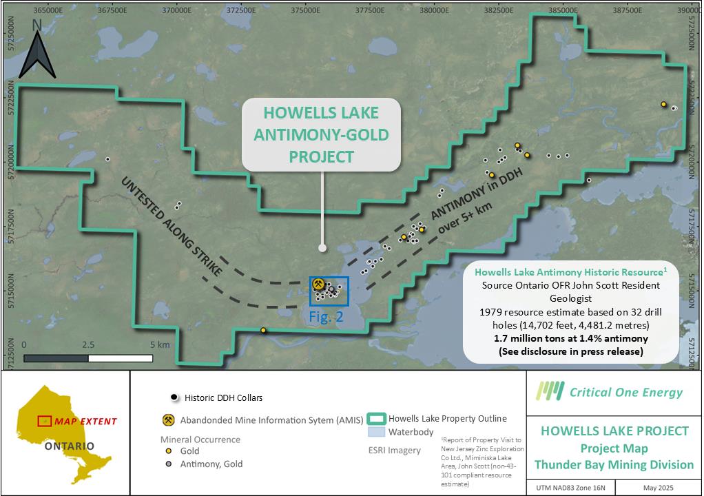 “The timing of our acquisition of the land packages that comprise the Howells Lake Project could not have been better, and the project is turning out to be even more compelling than we initially thought,” said Duane Parnham, Executive Chairman and CEO of Critical One.“With Western governments frantically looking to fast track critical mineral projects that are of vital importance, the antimony deposits at Howells Lake are a perfect fit for early development given its fundamentals, the critical need for antimony in North America and the fact that the project is south of the Ring of Fire, an area that is attracting a lot of government attention for critical mineral mining infrastructure development. With renewed government support for critical minerals project development, and armed with previous knowledge that is now combined with all this historic data, we are ready to get personnel on the property to start defining antimony and gold mineralization as soon as conditions permit.”