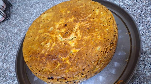 Rooted deeply in Irbid's culinary tradition, makmoora is a layered, oven-baked dish made with dough mixed with sesame and black seeds, generously soaked in olive oil, and filled with seasoned onions and chicken between each layer. The result: a crispy golden crust encasing a warm, soft interior, usually served in triangular slices.