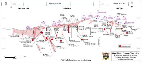 This hole was drilled approximately 60m south of hole GC25-48 (28.96m at 6.02 g/t Au) and 100m beneath Trench T9 (24.5m at 0.57g/t Au). Hole GC25-52 intersected 9.15m at 0.62 g/t Au and appears to define the northern limit of an approximate 25 to 75 metre gap between the Tyro Main zone and Northeast zone. Collectively, the results are suggesting that gold mineralization is transferring from the Tyro Footwall structure toward the Tyro Hanging Wall structure resulting in diminished structural dilation prior to the gold event.