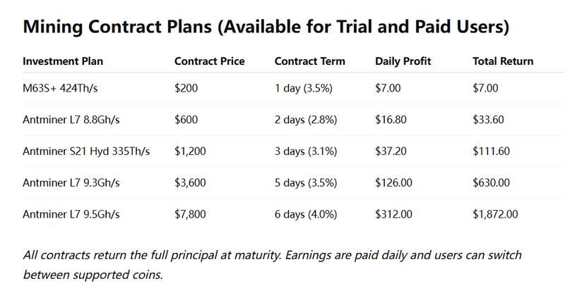 Security is a top priority. All funds are stored via cold wallet infrastructure, accounts are protected with 2FA, and all mining operations are governed by smart contract-based locking mechanisms that ensure transparency and automatic execution.