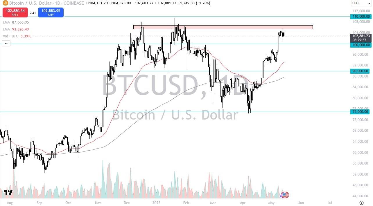 - Bitcoin has pulled back just a bit during the trading session on Wednesday as we continue to see a lot of noisy behavior. The market continues to look at the $106,000 level as a significant barrier, and I think at this point in time we are essentially trying and to work off some of the excess froth that we have seen in this market recently. After all, Bitcoin has rallied about 40% in the last month or so, which obviously is a big deal. Because of this, it's not a huge surprise to see that we are still struggling on Wednesday, just as we did over the last 3 or 4 sessions.