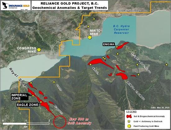 Geochemical surface sampling, geological mapping and prospecting is also planned in 2025 to better define drill targets along the southeast trend of the Royal Shear where a new 500 m soil anomaly was discovered (see news release March 24, 2025 ). Similar surficial work is planned at the Enigma and Olympic targets where surface grab sampling has returned gold values up to 25.1 gpt gold and 11.9% antimony (see news release February 6, 2024 ). A drill permit application is in progress for the Olympic and Enigma areas to facilitate drill testing in late 2025 or 2026. (See Figure 2 )