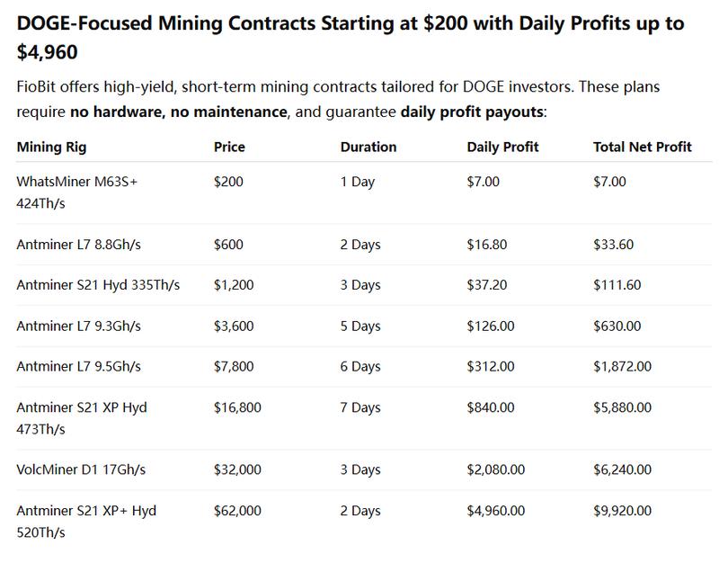 With support for multiple major cryptocurrencies including Bitcoin (BTC) and Dogecoin (DOGE), FioBit now offers the industry's most versatile and profitable high-yield cloud mining contracts 2025, tailored for both short- and mid-term investments.