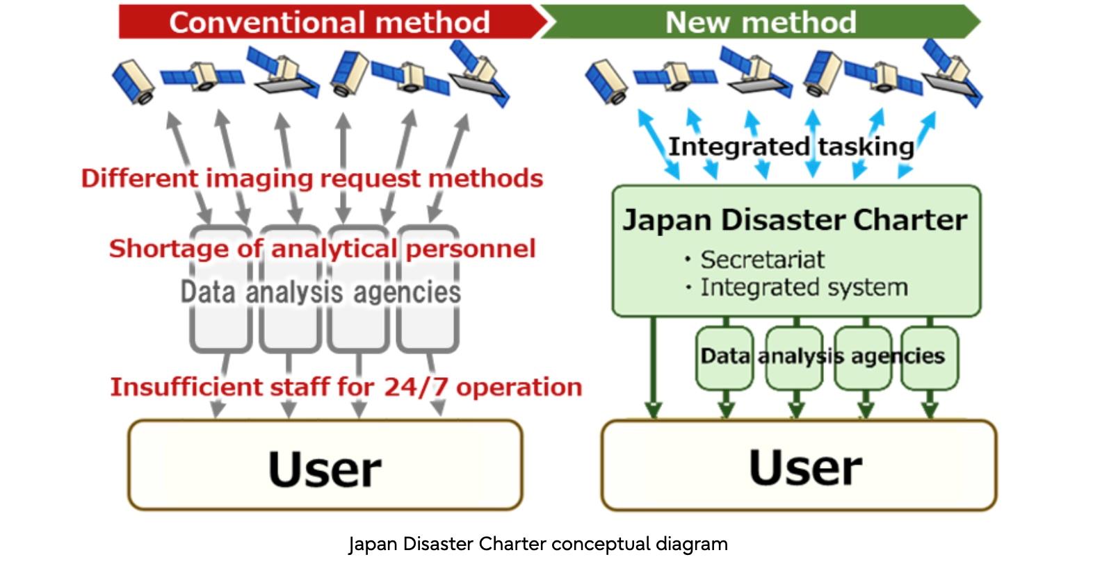 - The Japan Disaster Charter secretariat centralizes contracts and coordination with different satellite operators and data analytics agencies for each satellite, allowing users obtain the desired information in a one-stop manner without requiring specialized knowledge.