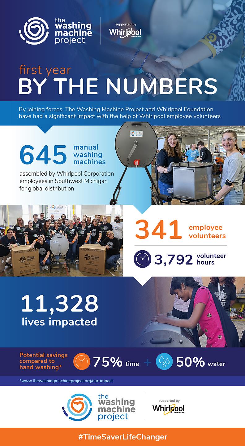 In the past year, 340 Whirlpool employee volunteers donated nearly 4,000 hours to build 645 manual washing machines using a manual assembly line thoughtfully developed by company volunteers. Whirlpool employees also participated in“Washout” events, where they were able to experience how grueling it can be to hand wash clothes, helping them build empathy with the majority of the global population who have no alternative but to do their laundry by hand. The Washing Machine Project and Whirlpool have distributed these machines to communities in India, Mexico, the Republic of Congo and Ghana - impacting over 11,000 lives and counting.