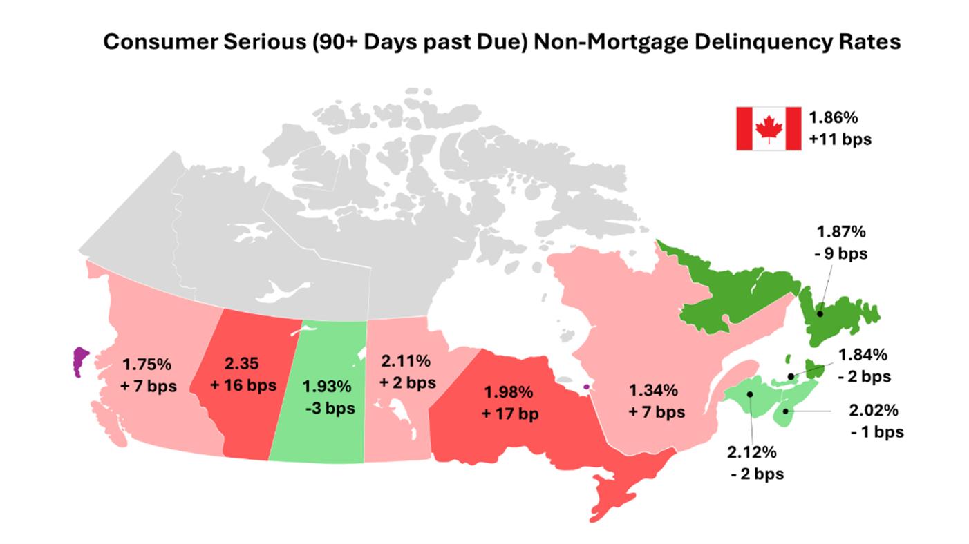 Additionally, the data shows regional disparities in the YoY growth rates of non-mortgage debt, although province rankings did not change from the previous quarter. P.E.I. and Newfoundland had the highest average debt per borrower, while Quebec and Manitoba had the lowest. While the gap between the highest and lowest average debt balances across provinces may not appear substantial, even modest differences in average debt per consumer can significantly influence delinquency rates. Consumers in provinces with higher average debt levels may be more susceptible to increases in interest rates as well as higher everyday living costs, making them more vulnerable to financial strain and increasing the likelihood of delinquency, particularly during economic downturns.