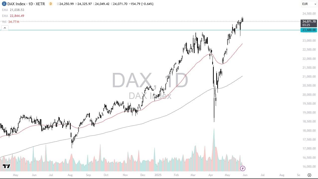 - The German DAX initially did try to rally a bit during the trading session on Wednesday, but we have seen sellers come back into the market to push things lower. By doing so, the market looks as if it is trying to sort out where we are going to go next and perhaps looks more likely than not to go looking for value hunters underneath. I do think there are plenty of people willing to get involved in this market, because after all, it has been extraordinarily bullish and has been one of the better performers that I follow.
