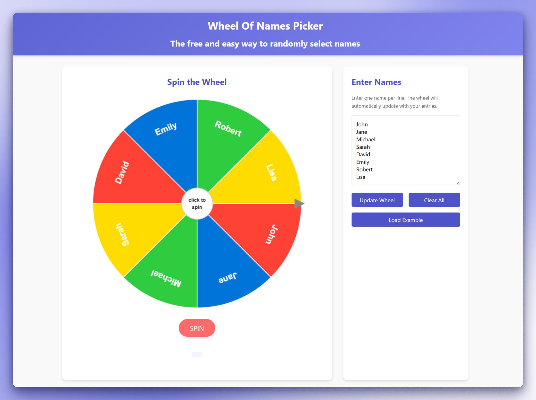 The platform provides a dynamic and intuitive interface that allows users to enter names or list items, customize the color and layout of a digital wheel, and instantly generate randomized results. As seen in the platform's interface, users can input entries line by line, update the wheel in real-time, and trigger a smooth spinning animation that selects a winner. Each name segment is color-coded and clearly labeled, providing an engaging and unbiased visual experience.