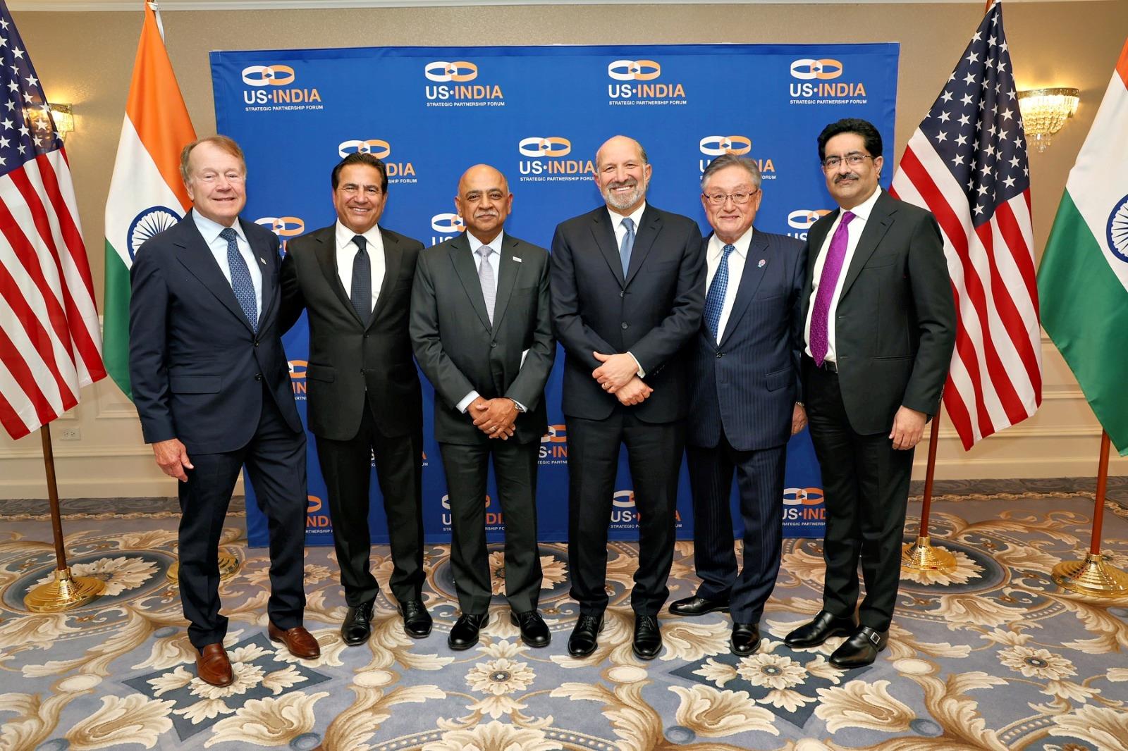 (L-R): John Chambers (Chairman, USISPF), Dr. Mukesh Aghi (President & CEO, USISPF), Arvind Krishna (Chairman & CEO, IBM), Secretary Howard Lutick (US Commerce), Toshiaki Higashihara (Chairman, Hitachi), Kumar Mangalam Birla (Chairman, Aditya Birla).