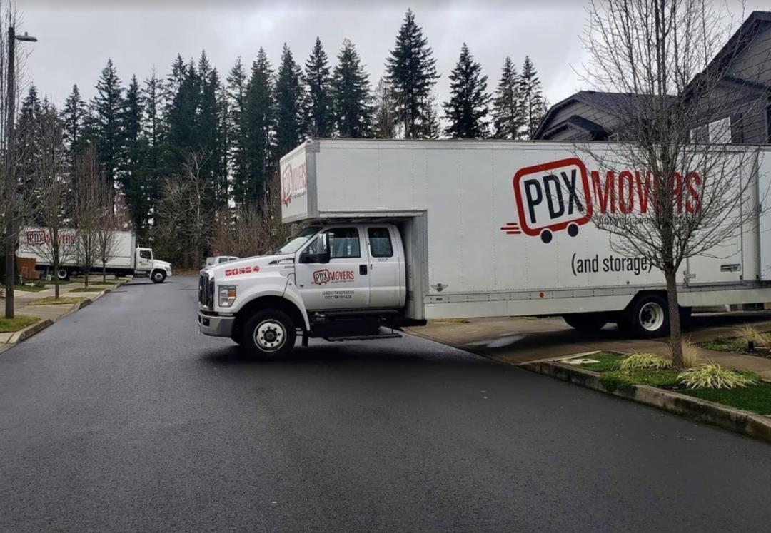 "PDX Movers trucks are positioned on a quiet residential street, ready to assist with a local move. The vehicles display bold company branding, highlighting their professional moving and storage services."