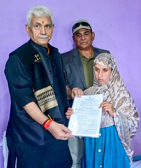The Lt Governor handed over a government job letter to Aadil's wife, Gulnar Akhtar.