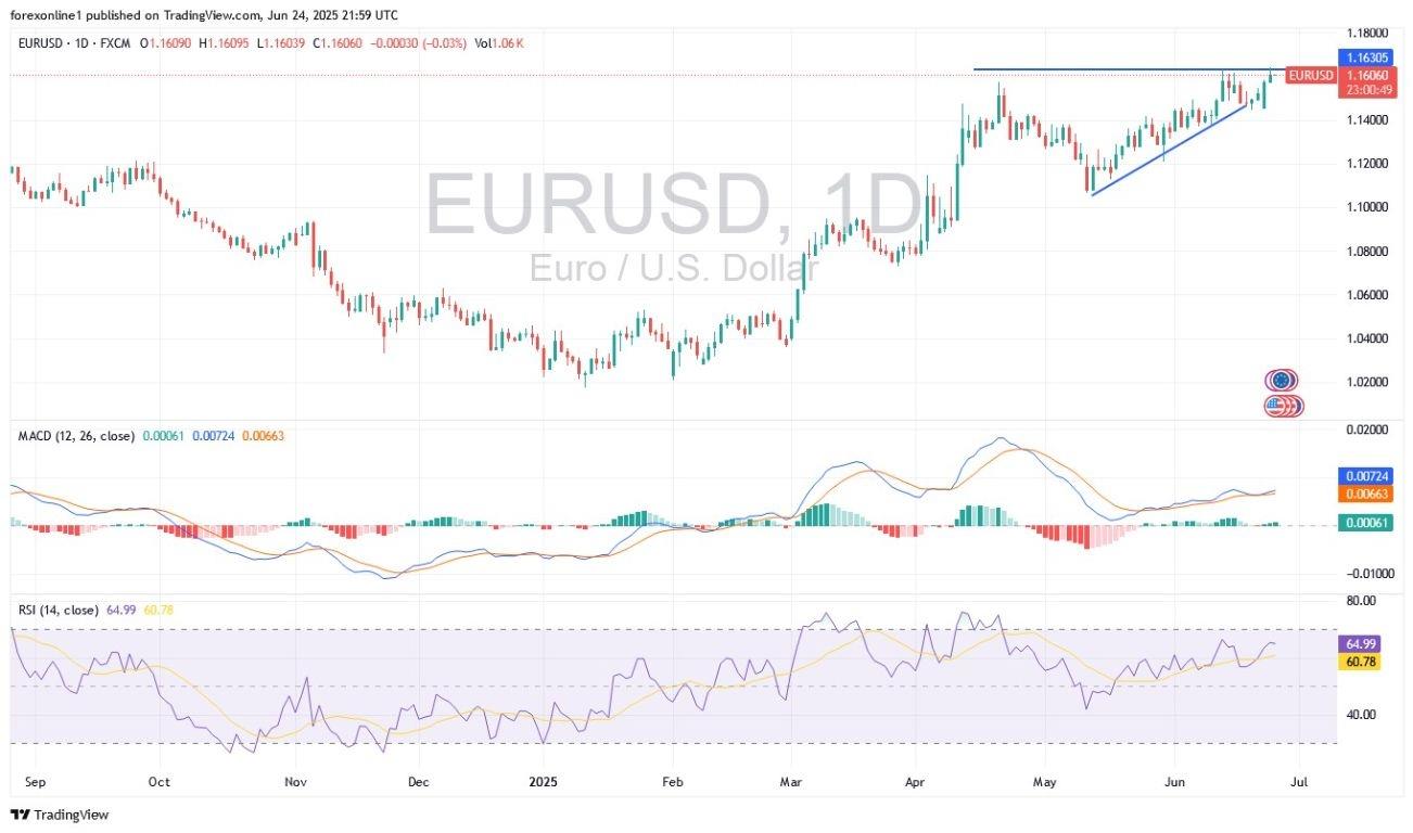 (MENAFN- Daily Forex) EUR/USD Analysis Summary TodayOverall Trend: Bullish\u0026#39;s EUR/USD Support Levels: 1.1542 \u0026ndash; 1.1470 \u0026ndash; 1390\u0026#39;s EUR/USD Resistance Levels: 1.1680 \u0026ndash; 1.1730 \u0026ndash; 1800/USD Trading Signals:Buy EUR/USD from the support level of 1.1490 with a target of 1.1720 and a stop-loss at 1400 EUR/USD from the resistance level of 1.1680 with a target of 1.1400 and a stop-loss at 1.1790. Top Forex Brokers 1 Get Started 74% of retail CFD accounts lose money Read Review BrokerGeoLists({ type: \u0027MobileTopBrokers\u0027, id: \u0027mobile-top-5\u0027, size: SidebarBrokerListAmount, getStartedText: \u0060Get Started\u0060, readReviewText: \u0060Read Review\u0060, Logo: \u0027broker_carrousel_i\u0027, Button: \u0027broker_carrousel_n\u0027, });EUR/USD Technical Analysis Today:For two consecutive trading sessions, the EUR/USD pair has been strongly moving upward, driven by improved investor and market sentiment. Gains extended to the 1.1641 resistance level at the time of writing, marking the pair\u0026#39;s highest point since 2021. The Euro\u0026#39;s gains increased amid the US dollar\u0026#39;s weak performance as traders continue to assess the situation in the Middle East. Recently, US President Trump announced a ceasefire between Israel and Iran, which eased concerns about potential supply disruptions in the energy sector. However, the truce is being tested as Israel has already accused Iran of violating the agreement the economic front, business sentiment in Germany improved, according to the Ifo Index, reaching its highest level in almost a year. However, preliminary PMI indicators painted a mixed picture, with private sector activity in the Eurozone showing signs of stabilization. Meanwhile, concerning monetary policy, analysts still expect a 25-basis-point interest rate cut by the European Central Bank (ECB) before the end of the year. For her part, ECB Governor Lagarde stated that \u0026quot;at current interest rate levels, we believe we are well-positioned to navigate uncertain conditions,\u0026quot; while Governing Council member Villeroy de Galhau said the ECB could still cut rates in the first half of next year Advice:Despite the gains, we still advise selling the Euro against the US Dollar from every upward level, but without taking risks, while closely monitoring factors influencing currency prices Levels for EUR/USD Today:Based on the daily timeframe chart, the EUR/USD pair\u0026#39;s direction remains bullish, and the break of the 1.1600 resistance confirms the strong bullish control over current performance. The 14-day RSI (Relative Strength Index) is around and above the 65 reading, supporting further bullish advances before the indicator reaches overbought territory. Confirming the current direction, the MACD (Moving Average Convergence Divergence) lines are still strongly upward. For technical indicators to move towards overbought percentages for the EUR/USD pair, a rebound towards the 1.1675 and 1.1740 resistance levels, respectively, is needed the downside, and according to performance across reliable trading platforms on the same timeframe, a break of the bullish trend for the EUR/USD pair would require a retreat to the 1.1445 and 1.1360 support levels, respectively. Today\u0026#39;s EUR/USD trading is not solely anticipating important European releases; the focus will also be on statements from Federal Reserve Chair Jerome Powell, which are scheduled for 5:00 PM Egypt time. EURUSD Chart by TradingView Federal Reserve Chair: No Rush to Cut RatesYesterday, Federal Reserve Chair Jerome Powell emphasized that there is no rush to cut US interest rates, according to his prepared remarks for a speech to the US Congress. His comments were consistent with previous statements, as several FOMC (Federal Open Market Committee) members have stated that it\u0026#39;s better to wait for a clearer understanding of the level of tariffs the US government will implement and their impact on the economy before adjusting key interest rates Committee kept the federal funds rate unchanged at 4.25%-4.50% for the fourth consecutive meeting in June 2025, in line with expectations. In the accompanying Summary of Economic Projections, the FOMC maintained its forecast for two interest rate cuts this year, though it expects only quarter-percentage-point cuts in 2026 and 2027. The Federal Reserve also lowered its GDP growth forecasts for 2025 to 1.4% (from 1.7% in March) and for 2026 to 1.6% (from 1.8%), while keeping the 2027 estimate unchanged at 1.8%.