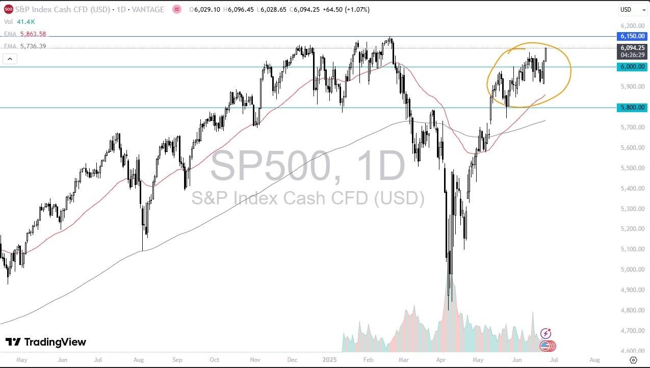 - During the trading session on Tuesday, we saw the S&P 500 rallied quite nicely, which started overnight in electronic overseas trading. Traders continue to look to the 6150 level, which was the all-time high a bank in the springtime. That being said, there is a massive amount of noise out there, and it has a lot of influence on how the market chooses to behave. While we are bullish, there are a lot of things out there to be very cautious about.