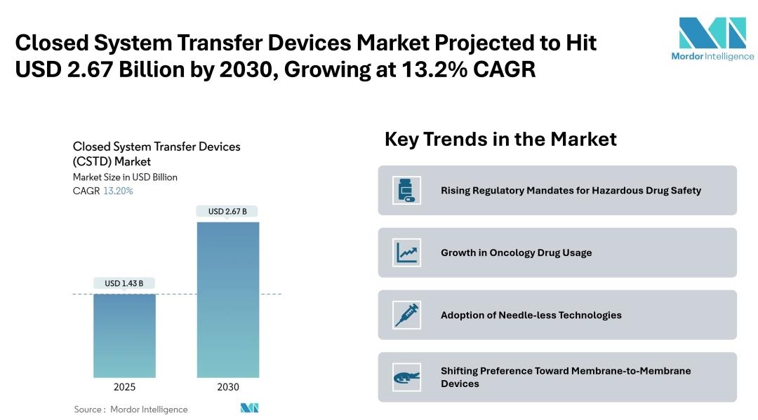 According to a 2025 report by Mordor Intelligence, the Closed System Transfer Devices market size is projected to grow from USD 1.43 billion in 2025 to USD 2.67 billion by 2030, registering a CAGR of 13.20% over the forecast period. The Closed System Transfer Devices (CSTD) market plays a crucial role in enhancing safety within healthcare settings by preventing the accidental release of hazardous drugs during preparation, transport, and administration. These systems are specifically designed to prevent the escape of aerosols or vapors, reducing the risk of exposure to healthcare workers and patients alike.