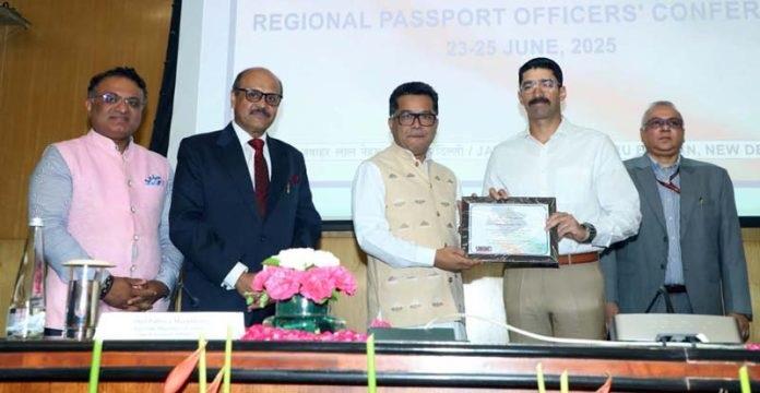 The prestigious Certificate of Recognition was presented to J&K Police by the Minister of State for External Affairs. The award was received by Rayees Mohammad Bhat (IPS), DIG CID, who represented J&K Police at the national event. This is the first time that the dedicated efforts of J&K Police in the timely disposal of passport cases have been formally acknowledged at the national level.