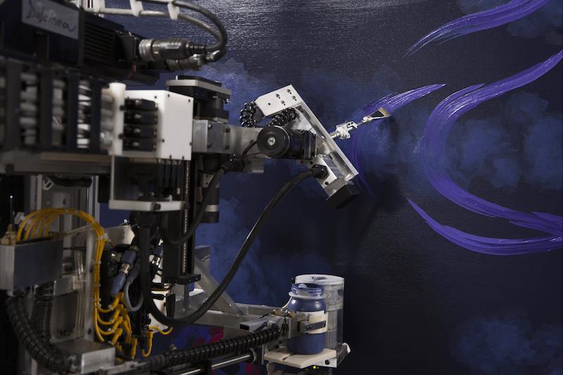 In the second phase, Dulcinea begins to physically execute the painting onto the canvas, using a workcell also developed by Kirby.