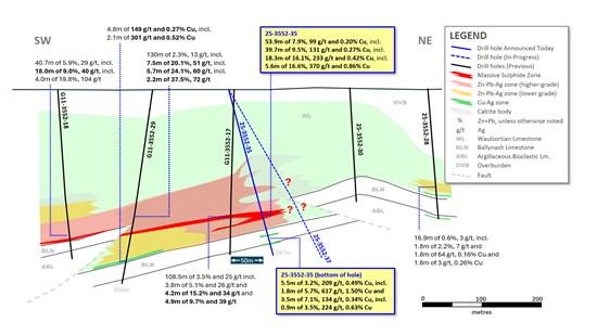 - 10.8m of 10.0% Zn+Pb and 109 g/t Ag (G11-468-03) 10.1m of 8.6% Zn+Pb and 46 g/t Ag (G11-468-06) 10.5m of 14.7% Zn+Pb, 399 g/t Ag and 0.31% Cu (G11-468-12) 11.2m of 8.9% Zn+Pb and 83 g/t Ag (G11-3552-03) 29.6m of 10.6% Zn+Pb, 78 g/t Ag and 0.15% Cu (G11-3552-12) and 11.8m of 11.6% Zn+Pb, 48 g/t Ag (G11-3552-18) 15.6m of 11.6% Zn+Pb, 122 g/t Ag and 0.19% Cu (G11-3552-27) 12.0m of 1.4% Zn+Pb, 560 g/t Ag, 2.30% Cu and 0.17% Sb (25-3552-31), including 6.4m of 2.1% Zn+Pb, 838 g/t Ag, 3.72% Cu and 0.27% Sb (25-3552-31) 39.7m of 9.5% Zn+Pb, 131 g/t Ag and 0.27% Cu (25-3552-35)
