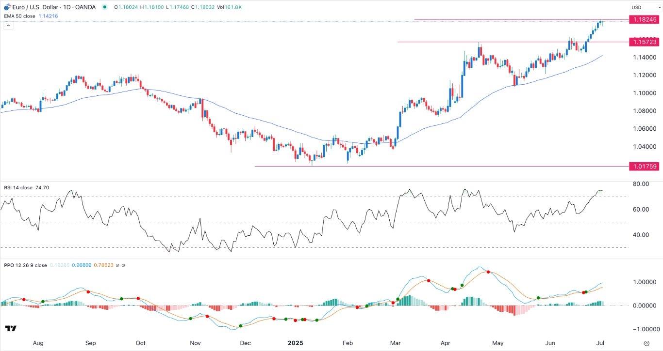 EURUSD Chart by TradingViewEUR/USD technical analysisThe daily chart shows that the EUR/USD exchange rate has been in a strong bull run in the past few months. It moved above the crucial resistance level at 1.1572, the highest point in April and June this year.The pair has remained above the 50-day Exponential Moving Average (EMA). Also, the Relative Strength Index (RSI) has moved above the overbought level. Similarly, the Percentage Price Oscillator has remained above the zero line since February. With the pair being overbought, it may retreat and retest the support level at 1.1572.Ready to trade our free Forex signals ? Here are the top brokers in Europe to choose from.
