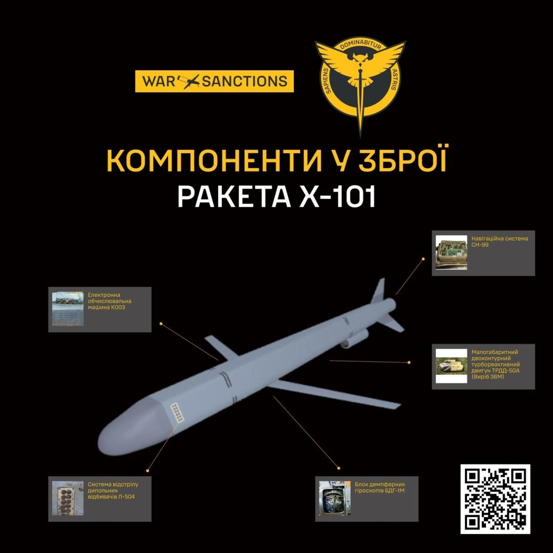 In the "Foreign Components in Weapons" section of the War & Sanctions portal, HUR presents the internal structure of the Kh-101 missile, including details on its main components and modules, as well as information on the enterprises involved in manufacturing the missile and its parts.