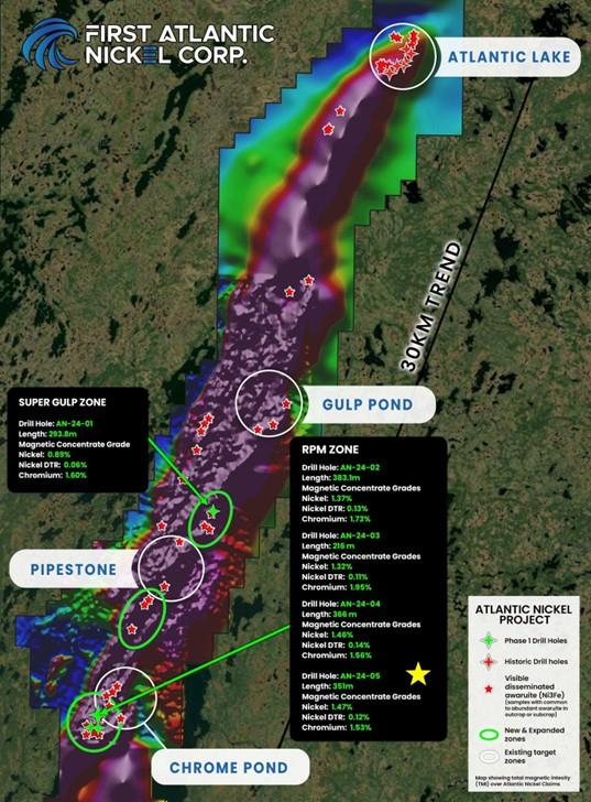 First Atlantic Nickel Expands RPM Zone Awaruite Nickel-Alloy (Ni3fe) Discovery: 400-Meter Northern Extension Yields 1.47% Nickel Concentrate Over 351 Meters In DTR Metallurgical Recovery Testing