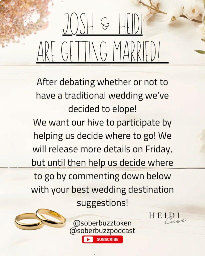 Originally, Josh and Heidi Case co-founders of Sober and the hosts of the“Spreading the Good BUZZ” podcast on the NXC Podcast Network planned to have a small wedding ceremony but outside distractions were getting in the way so the couple has decided to make their wedding about themselves other than a fun personal request to the Sober global community. Heidi posted this on Wednesday July 9th on their Instagram @SoberBuzzToken ;
