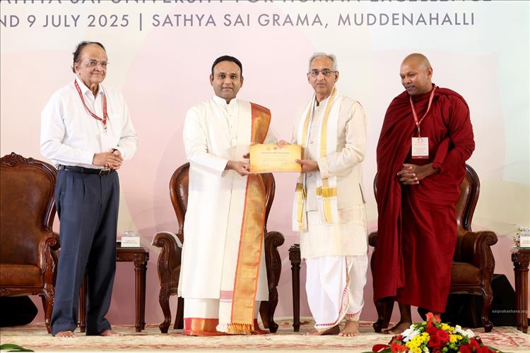 ‘Sri Sathya Sai Bharath Samskriti Samman’, a ceremony to honour the vedic tradition of India was held as part of the Inaugural Session of the Conference. The Samman chose the best vedic student, the ideal vedic teacher, and the best vedic pāthaśālā or gurukulam across the country, and awarded them with a cash prize, citation and medal, in an effort to encourage vedic learning and foster vedic culture. The Sri Sathya Sai University for Human Excellence also awarded scholarships worth 25,000 INR to 100 students of the Banaras Hindu University, as part of the collaborative Memorandum of Understanding which was exchanged with Banaras Hindu University’s Bharat Adhyayan Kendra in the year 2022.