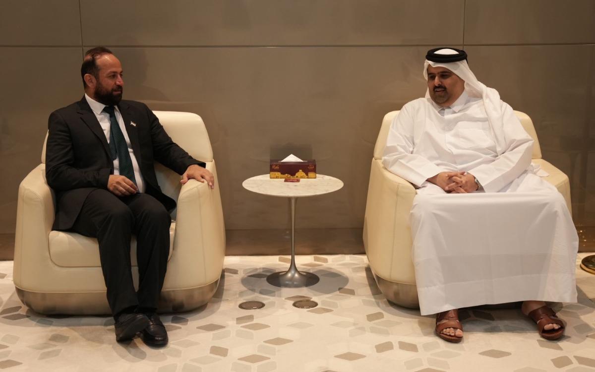 Doha, Qatar: Acting CEO of the Qatar Media Corporation HE Sheikh Khalid bin Abdulaziz bin Jassim Al-Thani received Minister of Information of the Syrian Arab Republic HE Dr. Hamza Al-Mustafa, upon his arrival in Doha for an official visit.