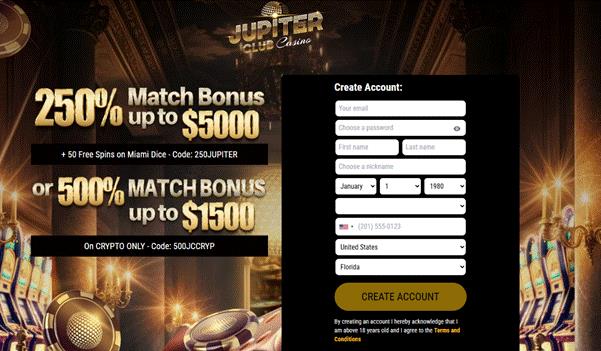 - Get a 250% Match Bonus up to $5,000 and 50 Free Spins on Miami Dice with code 250JUPITER .