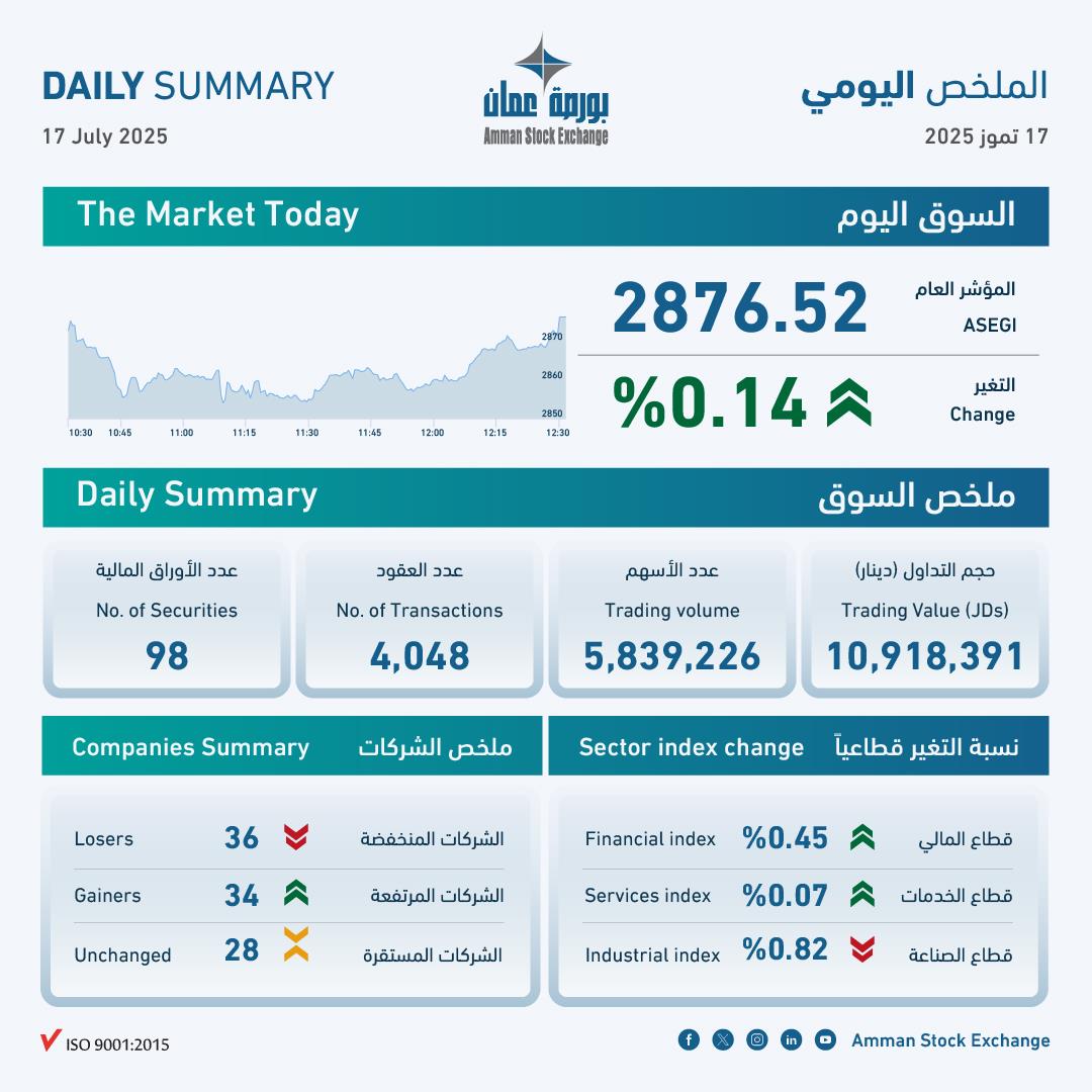 Amman, July 17 (Petra) -- The Amman Stock Exchange (ASE) closed Thursday's trading session with a 0.14 percent rise, reaching 2,876 points.