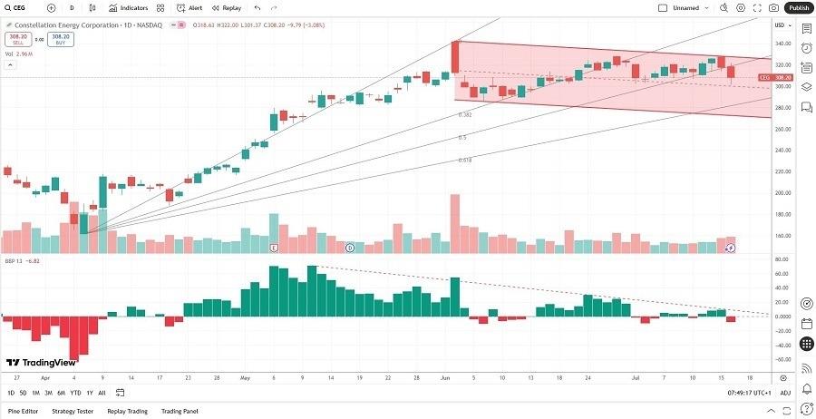 (MENAFN- Daily Forex) Long-term growth potential faces short-term capital issues, which creates an interesting trade. Should investors focus on the longer-term green energy push or short-term capital-intensive investments?Short Trade IdeaEnter your short position between 301.37 (yesterday's intra-day low) and 313.89 (the intra-day low of its last bullish candlestick).Market Index Analysis Constellation Energy (CEG) is a member of the NASDAQ 100 and the S&P 500. Both indices remain near record highs with rising bearish trading volumes. The Bull Bear Power Indicator of the S&P 500 shows a negative divergence.