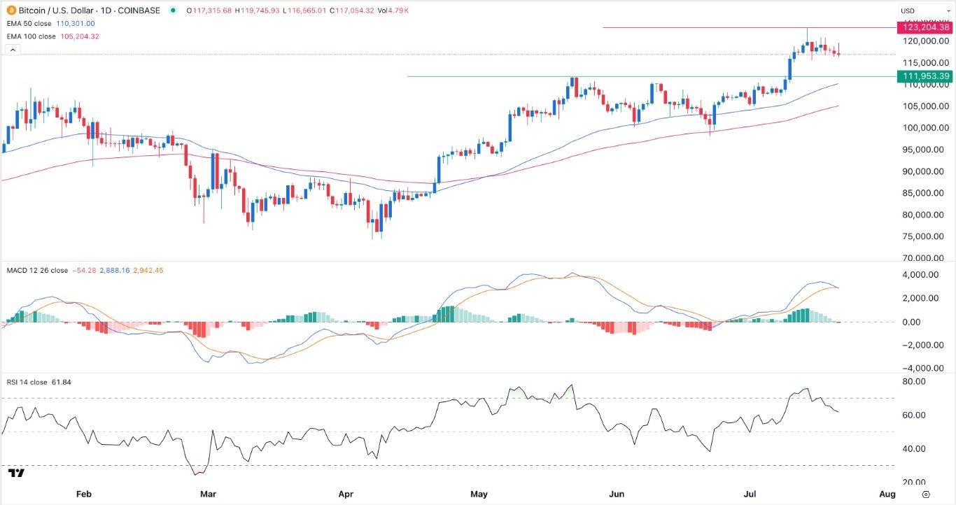 EURUSD Chart by TradingViewBTC/USD technical analysisThe daily chart indicates that the BTC/USD pair has pulled back over the past few days, declining from a high of 123,200 to approximately 116,800. It remains above the important support level at 112,000.The two lines of the MACD indicator have formed a bearish crossover pattern. Also, the Relative Strength Index (RSI) has moved below the overbought level at 61, down from this month's high of 75.Therefore, the BTC/USD pair will likely remain under pressure in the coming days. It will then bounce back in the coming days, with the target being at 123,00. The alternative scenario is where it drops and retests the support at 112,000.Ready to trade our free Forex signals ? Here are the best MT4 crypto brokers to choose from.