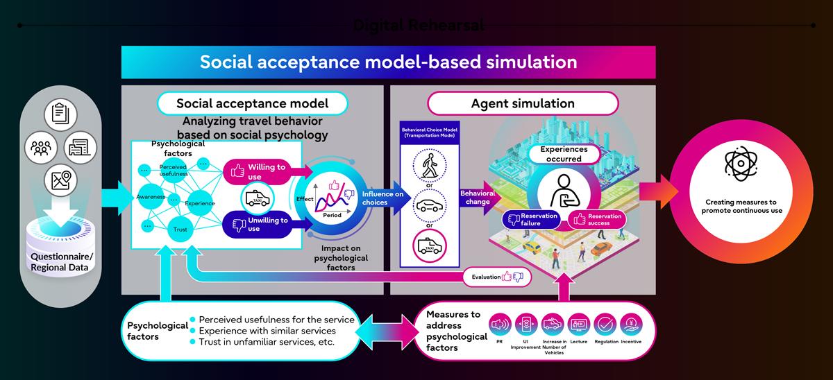 The "Social Acceptance Model," developed by Nagoya University, provides a framework for understanding the psychological drivers behind transportation choices. By integrating this model with Fujitsu's agent simulation digital rehearsal technology, which accurately reproduces and predicts human behavior on digital twins, the system can assess how various interventions – such as targeted advertising or other service improvements – will affect residents' perceptions and consequently their willingness to use the service.