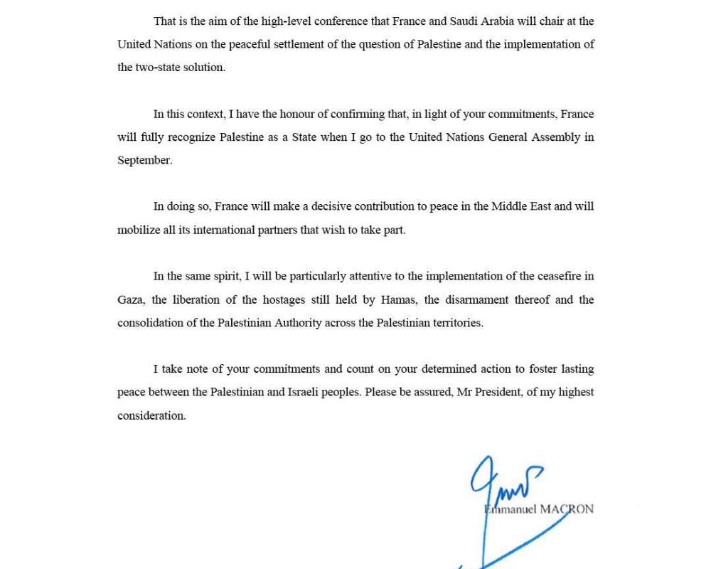 The move, Macron said, is a direct response to the "courageous commitments" expressed by the Palestinian leadership in their June 9 letter, including support for a two-state solution, condemnation of the October 7, 2023, Hamas attacks, and pledges to implement democratic reforms and assume full sovereign responsibility across all Palestinian territories, including the Gaza Strip.
