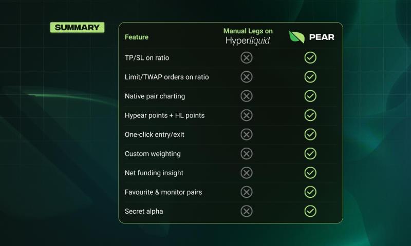 Pear makes advanced strategies simple, mobile-friendly, and capital-efficient – whether you're trading HYPE/SOL or building custom ETH/BTC trades with beta-weighted logic.