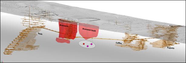 Figure 1. Oblique view (looking north-east) of the Costerfield gold-antimony field, showing Mandalay underground development, current resource outlines of the Brunswick deposits, and the central position of the three drill intercepts reported in this announcement.