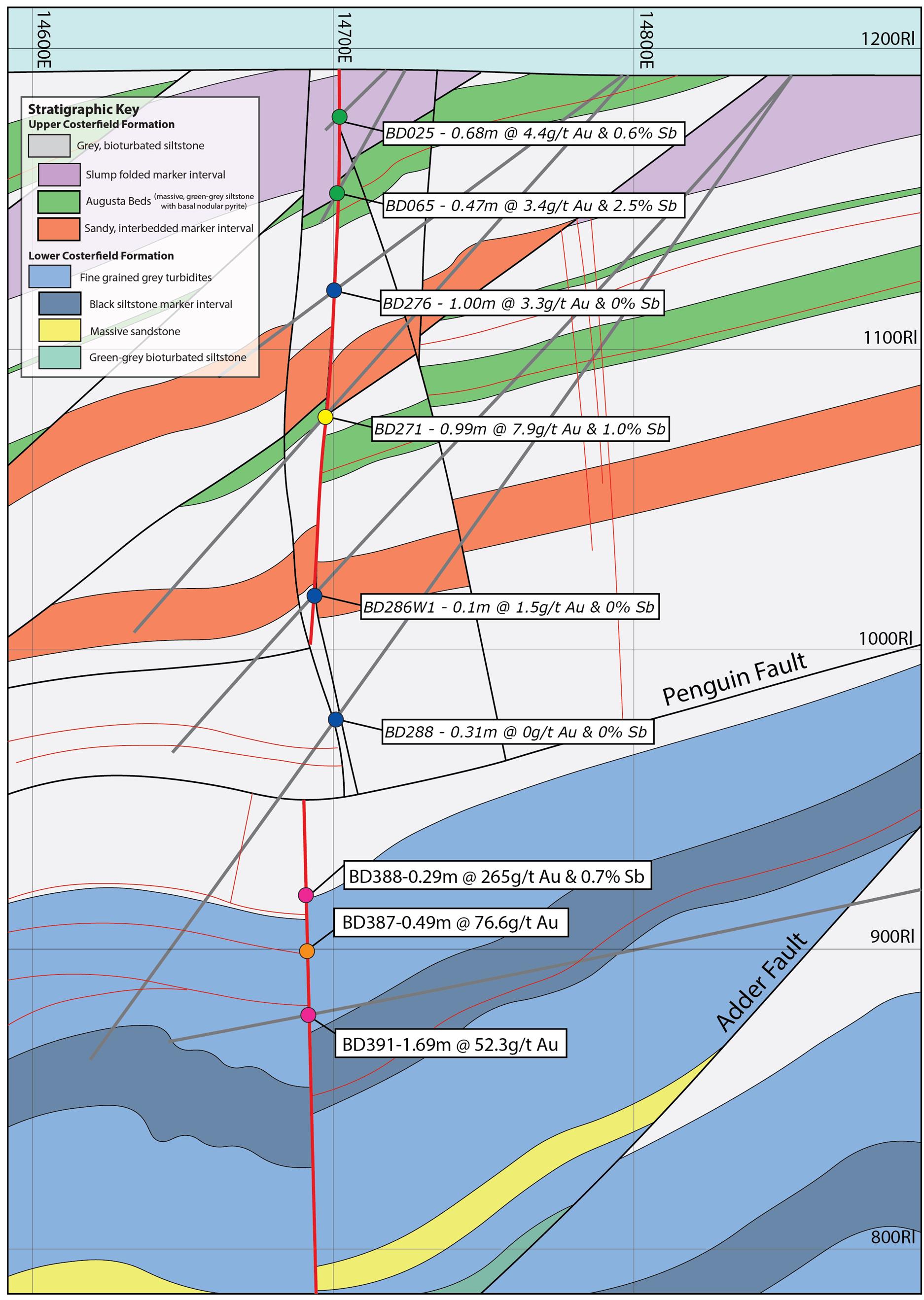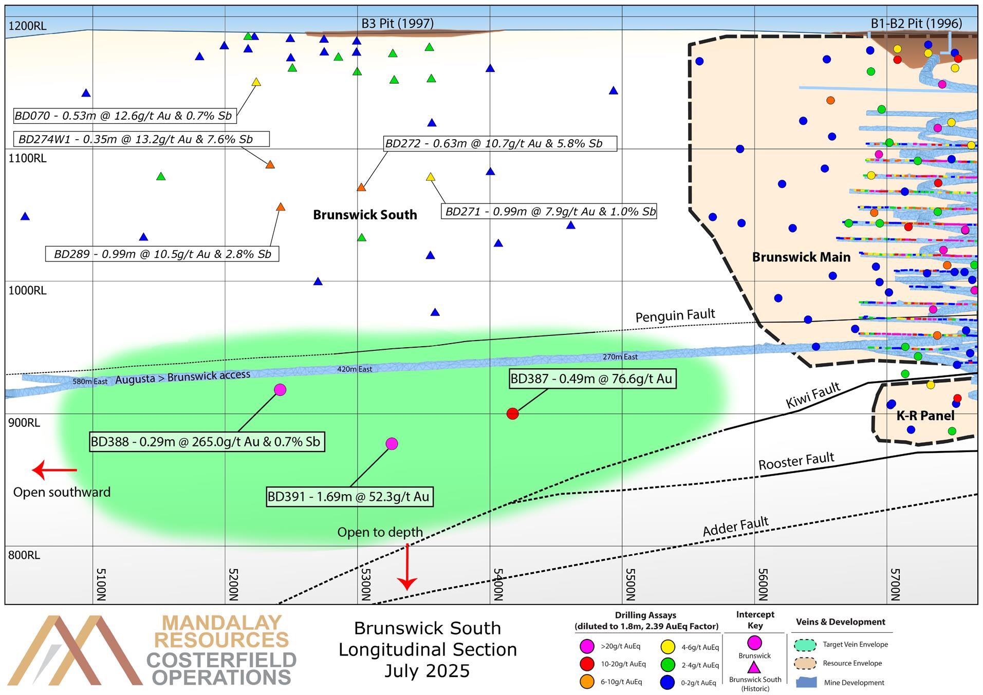 BD387 intersected the Brunswick vein approximately 270m south of the limit of existing development on the Brunswick Main lode. The vein intersected graded 76.6 g/t gold over 0.49m downhole, consisting of healed quartz breccia containing visible gold. BD388 passed through the vein 175m south of BD387, and found higher grade mineralization at 265 g/t gold and 0.7% antimony over 0.29m downhole. Clusters of fine visible gold are evenly spread throughout the quartz in this intercept, and stibnite is present as a late-stage vein infill phase. A third hole (BD391) was directed between and approximately 30m down-dip of the two prior intercepts and also intercepted high-grade gold mineralization, 52.3g/t gold over 1.69m downhole.