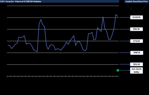 While each peer has a distinct focus, they are all aerospace and defense technology companies that we believe are well positioned to benefit from similar tailwinds. Over the past five years, this Comp Set has generally traded at 20x to 40x EBITDA, with further multiple expansion seen in 2025. The chart below illustrates the implied Viasat share price after applying these historical ranges to DAT, alongside a fixed 4.0x multiple for Communication Services and our assumptions for the present value of the recent Ligado Networks settlement.