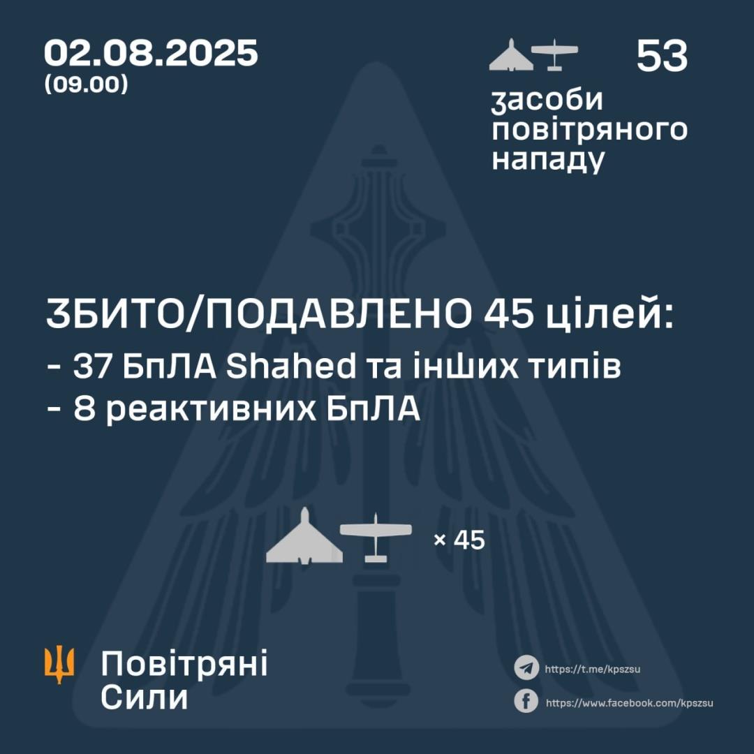 Read also: Russian army loses another 1,010 troops in war against UkraineAs of 09:00 on Saturday, August 2, preliminary data confirmed that 45 UAVs had been destroyed, including eight jet-powered drones and 37 Shahed UAVs and decoy drones. Eight UAVs were intercepted across five locations, with debris from downed drones falling in two areas.