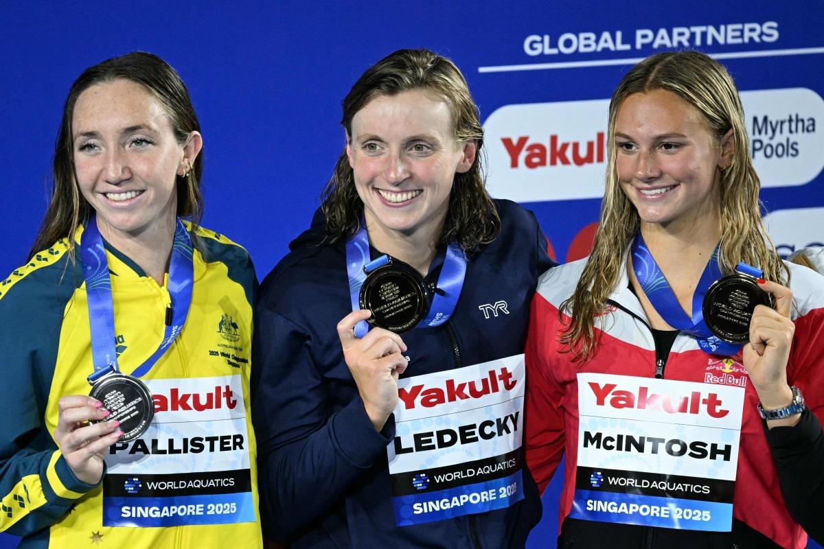 Singapore: United States great Katie Ledecky beat Summer McIntosh in a titanic three-way battle to win a thrilling 800m freestyle world title in Singapore on Saturday.
