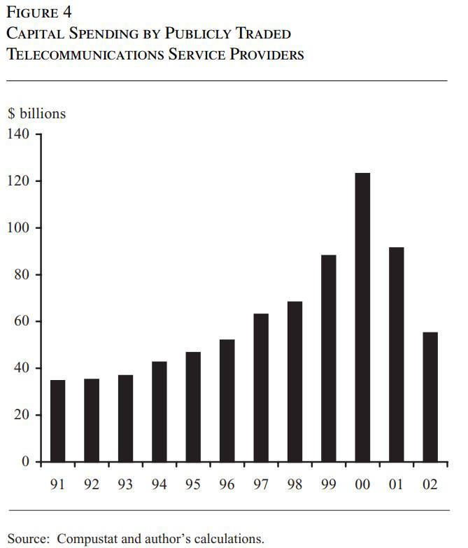 Side note: I'm actually not sure Kedrosky is right about the height of the telecom boom. His chart shows the level of capex for 2020, when 5G and fiber infrastructure was being built out. But Doms (2004) shows US telecom capex reaching $120 billion in 2000: