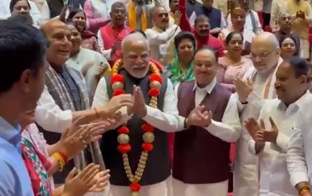 At the key NDA meet in Delhi, PM Modi was garlanded by Defence Minister Rajnath Singh and felicitated by fellow members, amid thunderous applause and chants of 'Har Har Mahadev'.