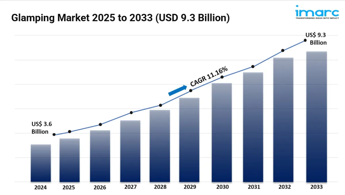 The glamping market is experiencing rapid growth, driven by rising demand for luxury outdoor experiences, government schemes and tourism promotion, and increasing disposable income and experiential travel. According to IMARC Group's latest research publication,“ Glamping Market Size, Share, Trends and Forecast by Type, Age Group, Size, and Region, 2025-2033 “ , the global glamping market size was valued at USD 3.6 Billion in 2024. Looking forward, IMARC Group estimates the market to reach USD 9.3 Billion by 2033, exhibiting a CAGR of 11.16% during 2025-2033.