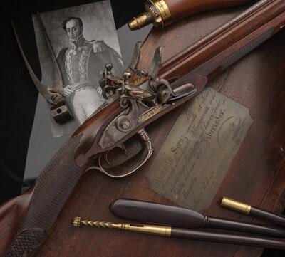 The French sporting arm remains in impressive condition with gold inlays and bright silver furniture depicting relief engraved scenes of Greek mythology's Calydonian boar hunt. Crafted in 1822 by Parisian gunmaker Baucheron Pirmet, the flintlock shotgun is a definitive example of the high quality European arms of the era. Out of the collection of noted fine arms collector Norman R. Blank, it is believed to be the last firearm of Simón Bolívar yet in private hands. The auction will mark the first time the gun has been publicly offered.